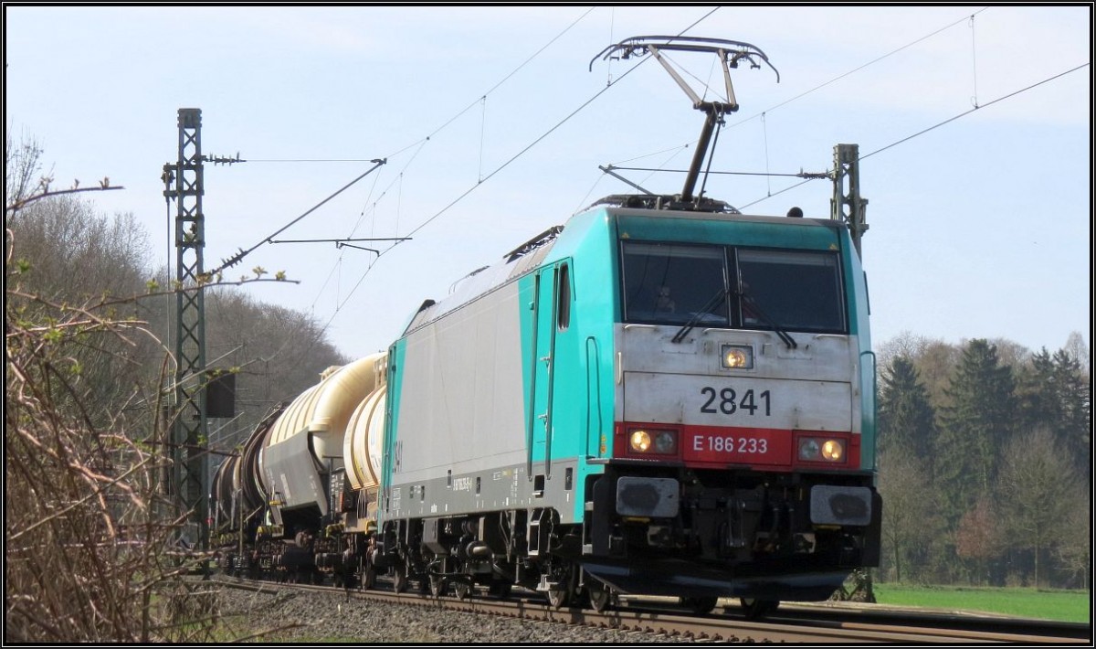 Die belgische 2841 ist mit einen kurzen Kesselwagenzug auf der Kbs 485 unterwegs. Hier zu sehen unweit von Übach Palenberg bei Rimburg Anfang April 2015. (to the image)