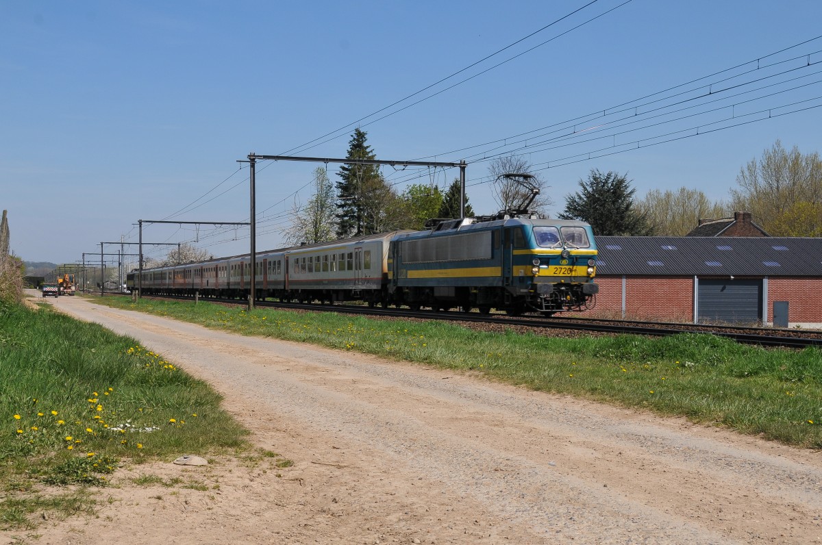 HLE 2720 zieht den IC2210 Gent St.Pieters -Tongeren, bestehend aus einem I10- und fünf M4-Wagen sowie HLE 2710 als Schublok. Hier aufgenommen am 21/04/2015 kurz vor Erreichen des Zielbahnhofs. (to the image)
