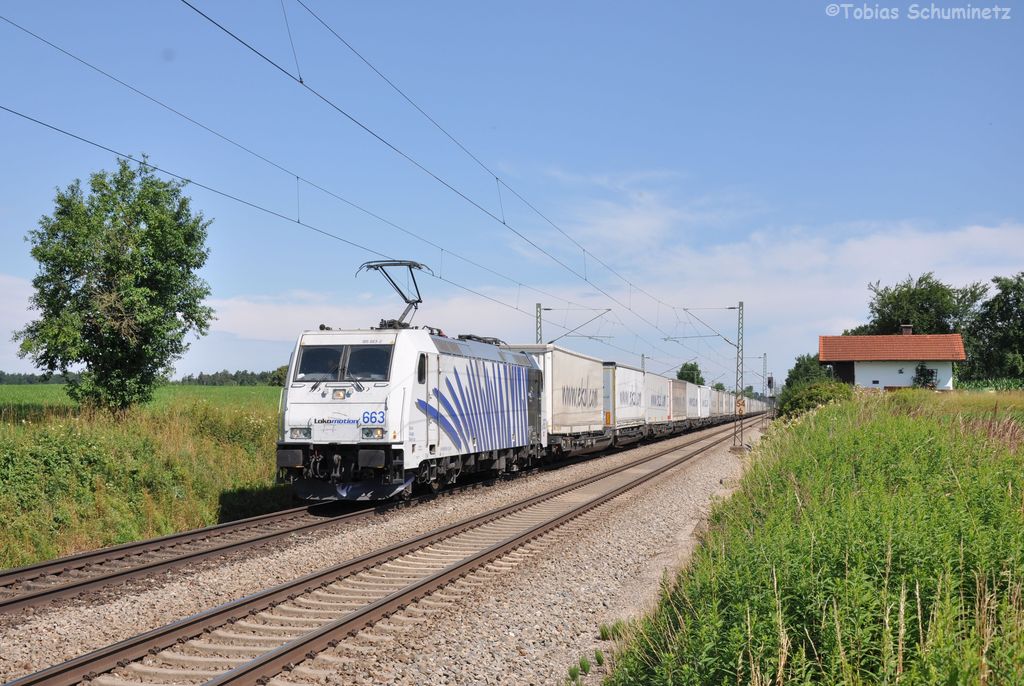 185 663 mit EKOL-Zug am 08.07.2012 an der ehemaligen Blockstelle Hilperting (to the image)