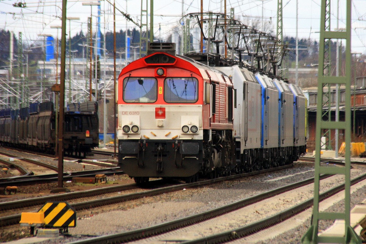 Zugbegegnung in Köln-West. 185 018 mit einem Güterzug am Haken kreuzt die DE13 der HGK. Rechts halb verdeckt parkt die ES64U2-077 der Wiener Lokalbahnen. Aufgenommen am 13/06/2009. (to the image)
