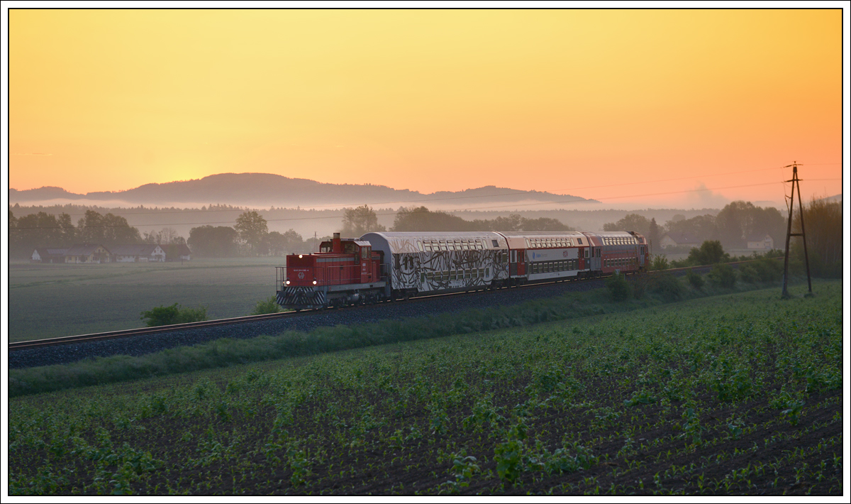 Wenn man so eine Bildidee im Kopf hat, die Sonne an der Stelle um 5:28 aufgegangen ist, aber der Demmerkogel um 5:44 doch etwas höher als angenommen ist, und die aufgehende Sonne noch verdeckt - naja, probieren wir es in ein paar Tage noch einmal. 1500.2 mit dem R 4354 (S6 Wies-Graz), am 6.5.20, so gesehen bereits nach Sonnenaufgang, kurz vor dem Bahnhof Bergla. (to the image)