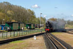 Der Rasende Roland der RüBB dampft mit der Lok 99 4632 an Reisezugwagen in Putbus vorbei, die derzeit noch abgestellt sind und hoffentlich bald wieder zum Einsatz kommen, denn mittlerweile werden die Züge wieder länger. - 02.05.2020 (to the image)
