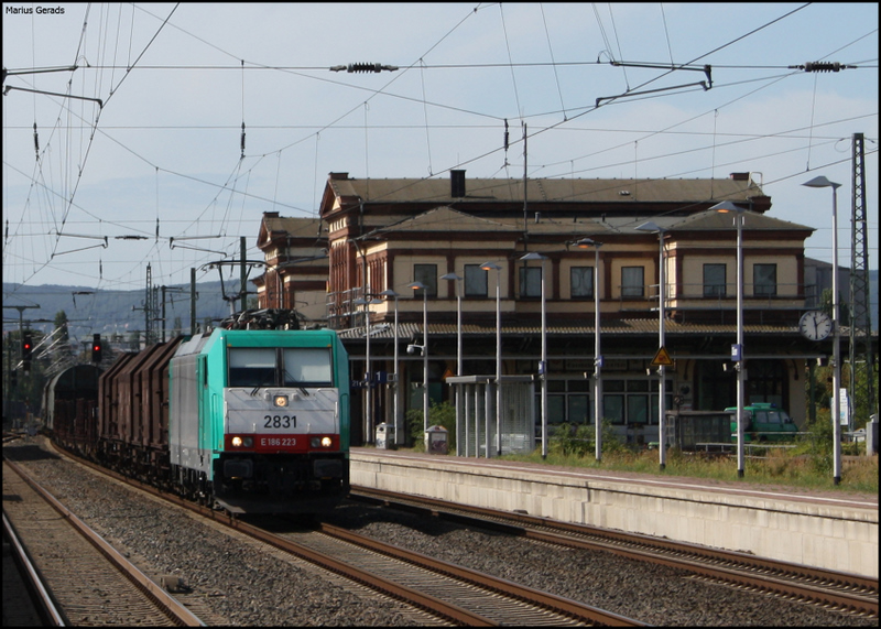 Schön, dass du das ganze Gebäude mit auf das Bild genommen hast. Noch schöner wäre es gewesen, wenn du links auch den Gleisverlauf des zweiten Gleises mit auf das Bild genommen hättest, soll jetzt aber nicht bedeuten, dass mir das Bild nicht gefällt, im Gegenteil. Die meisten Leute hätten den Zug viel weiter vor fahren lassen, und das (Bahnhofs??)Gebäude wäre halb verdeckt gewesen.