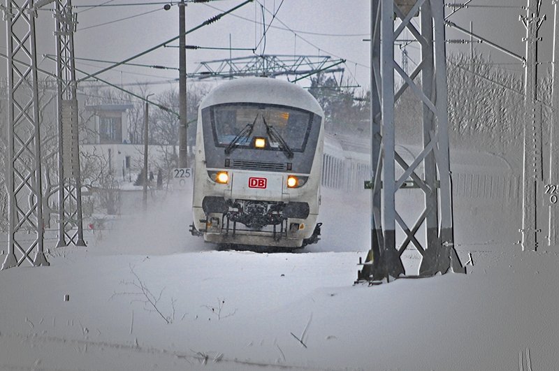 ein IC hat den Bf Stralsund verlassen mit Steuerwagen vorraus Richtung Rügen, Ziel Ostseebad Binz am 10.02.2010 (to the image)