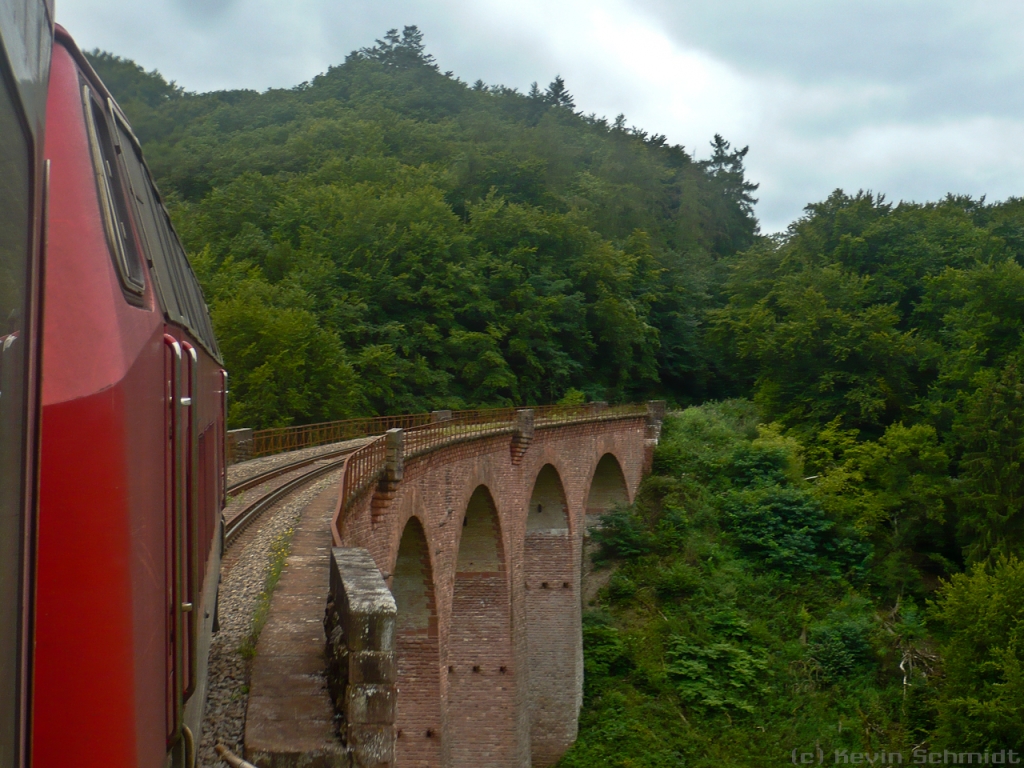 Tag 6: Endlich begann die abenteuerliche Fahrt von Boppard nach Emmelshausen über die Hunsrückbahn! Wir hatten uns direkt hinter der 218 414-1 einquartiert. Hier steht uns gerade das Hubertus-Viadukt bevor. (to the image)