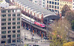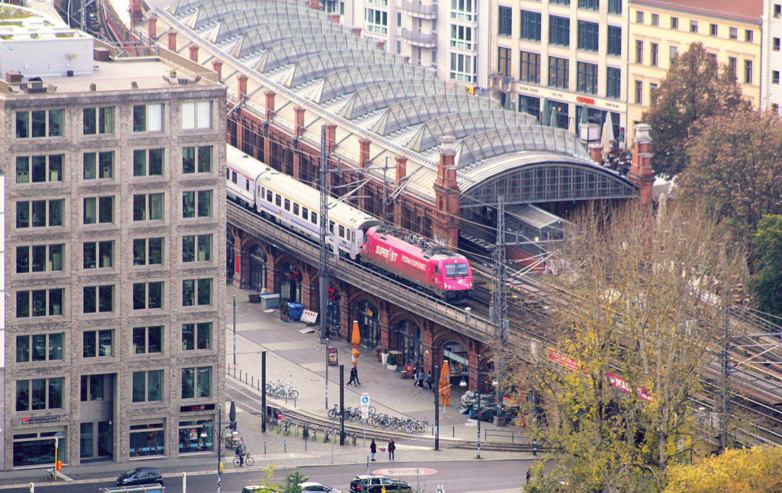 Tief unten im Tal fährt ein Zug durch die Häuserschluchten nach Osten; ein tolles Bild.