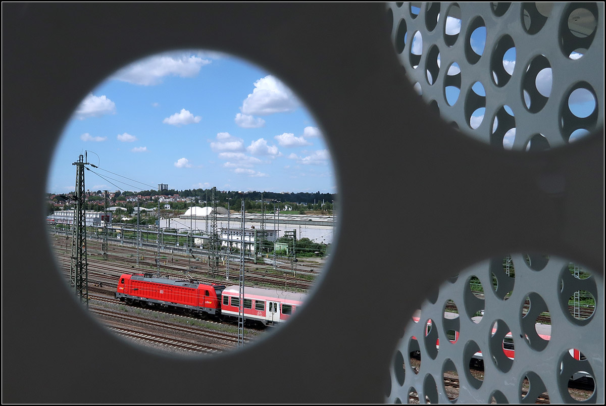 Die Lok im Focus - Einfahrende RE in den Heilbronner Hauptbahnhof. Vom Experimenta Parkhaus aus gesehen. 01.08.2019 (M) (to the image)