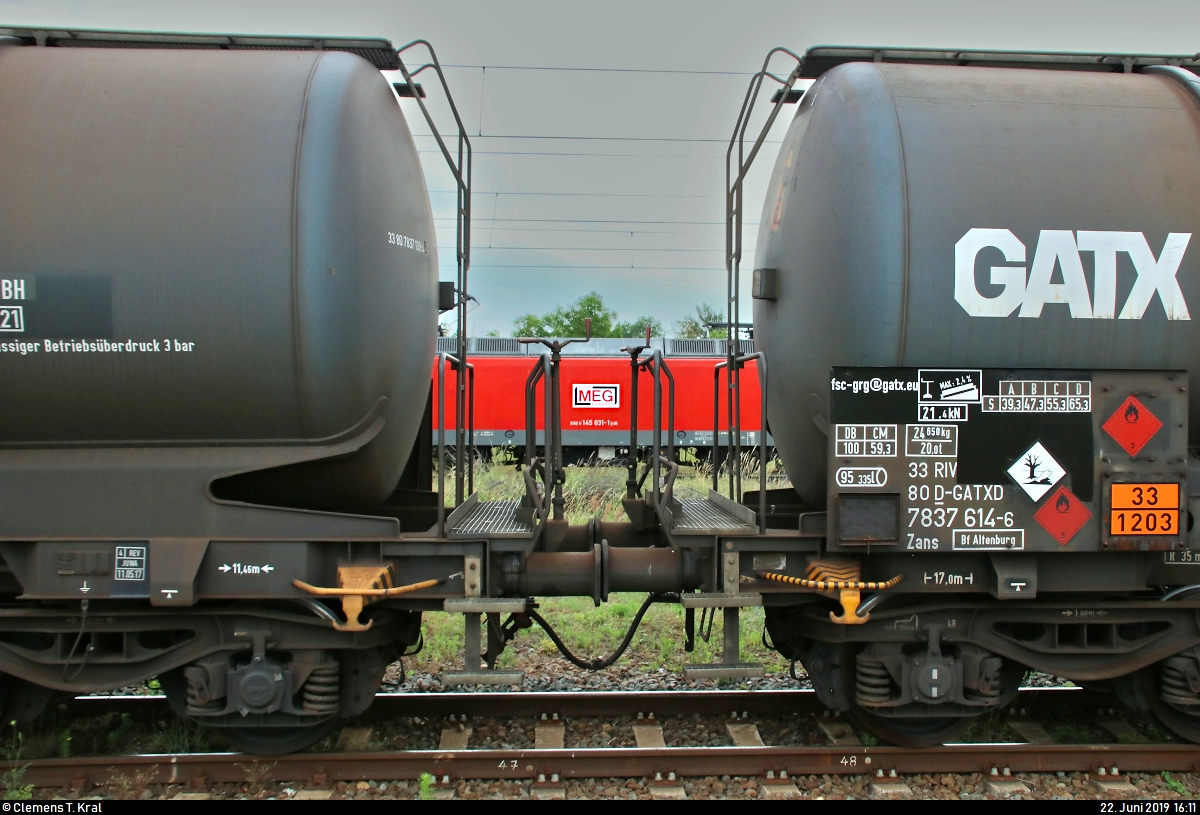 Kesselzug mal Zwei: Das Alltagsgeschäft der MEG... Während im Bahnhof Angersdorf vordergründig Kesselwagen abgestellt sind, befährt im Hintergrund ein weiterer Kesselzug mit 145 031-1 DB, vermietet an die Mitteldeutsche Eisenbahn GmbH (MEG), kommend aus Richtung Buna Werke, das Gleis von der Bahnstrecke Merseburg–Halle-Nietleben (KBS 588). Dabei wurde das MEG-Logo zwischen beiden Kesselwagen eingepasst. Das in Schkopau ansässige Unternehmen übernimmt einen Großteil der Kesselzüge im Gebiet Angersdorf. Mit diesem Bild soll dessen Bedeutung symbolisiert werden. [22.6.2019 | 16:11 Uhr] (to the image)