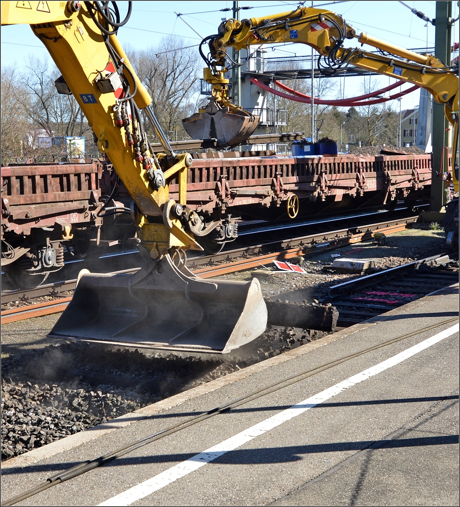 Danke Daniel, genial war vor allem, wie der Baggerfahrer diese Arbeiten erledigt hat. Schotterbett ebnen und Schwellen rauskicken. Im Nu waren die fertig. Nachdem der Zug beladen und weggefahren, haben sie dann doch noch eine vergessene Schwelle tief vergraben gefunden... :-D