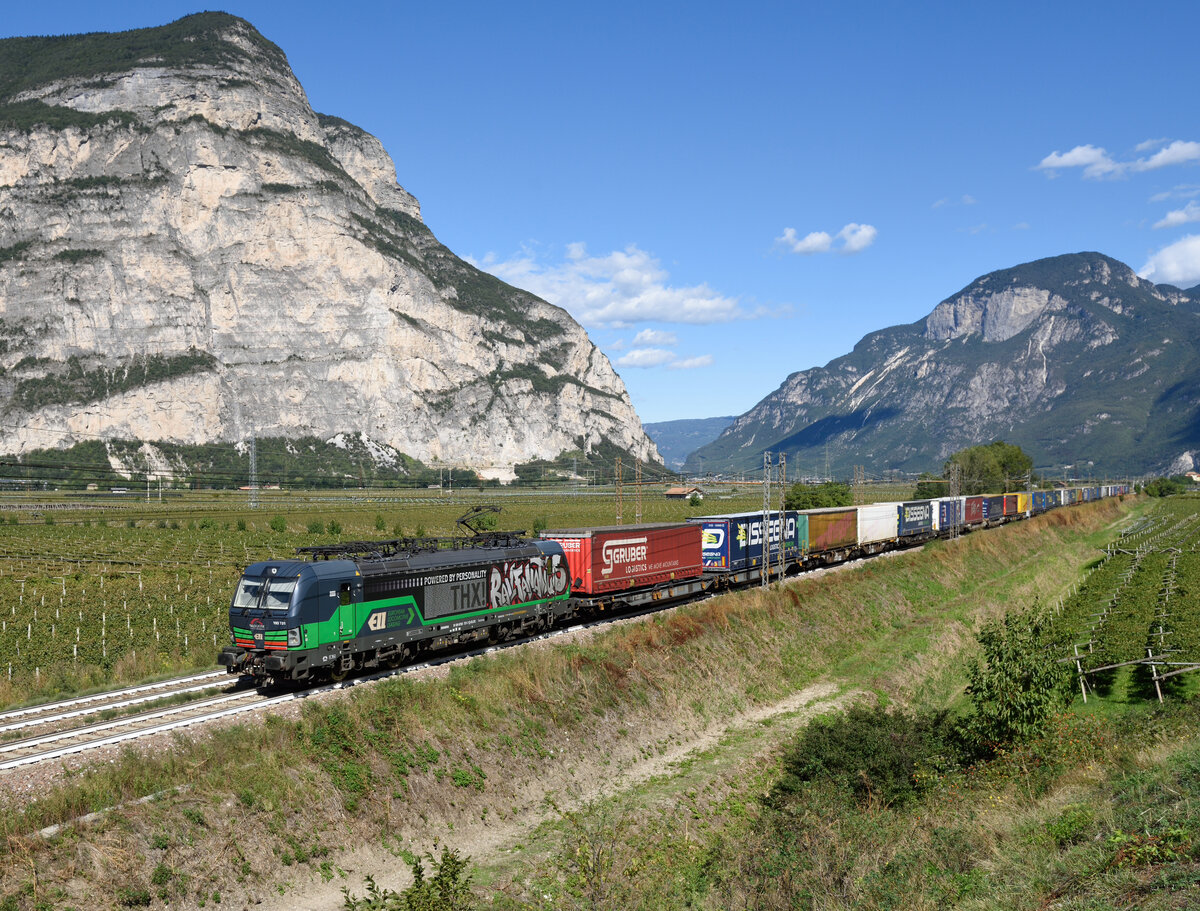 Ein sehr schönes Motiv mit dem bunten KLV-Zug und den hohen Bergen im Hintergrund. Interessant auch, dass das Tal komplett flach ist und es dann sehr steile Bergwände gibt. Die Brennerstrecke ist landschaftlich sehr reizvoll. In Rostock und Umgebung hatte ich bis jetzt leider immer Pech mit den schönen Werbeloks von TXL...