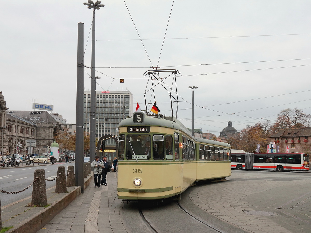 Großraumtriebwagen 305 steht hier in der Wendeschleife vor dem Nürnberger Hauptbahnhof (über dem Westflügel "schwebt" die Werbung der Firma DIEHL).