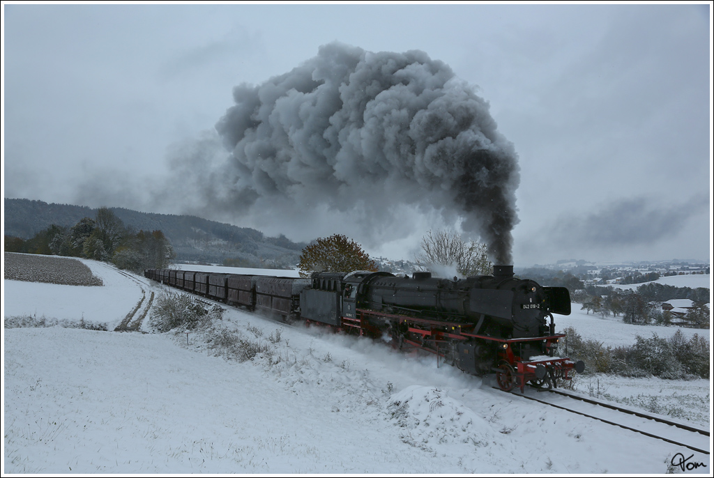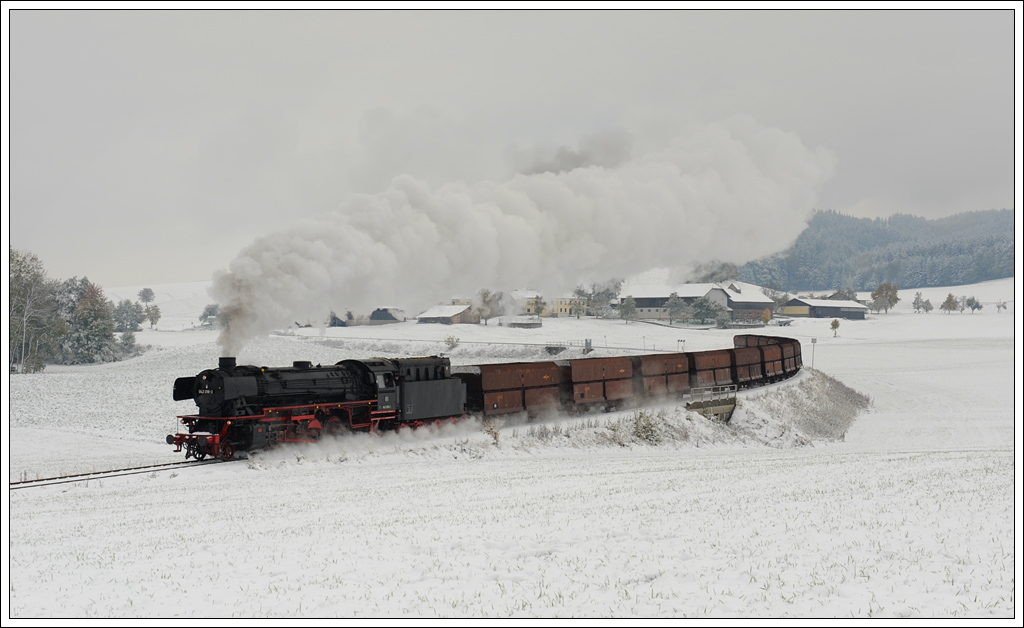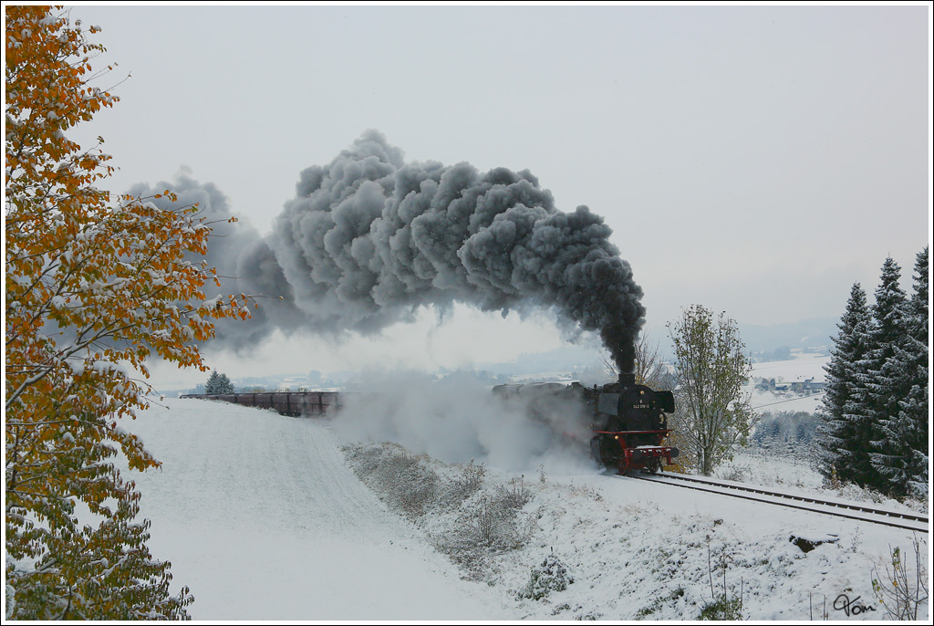 @ Kay: Sie ist absolut deplaziert in Österreich, aber vielleicht hat ja genau das seinen Reiz, noch dazu bei den Witterungsverhältnissen, die wir gestern hatten. Sie war einige Woche zu Gast in Ampflwang und bespannte ein paar Sonderzüge in dieser Zeit. An diesem Wochenende ging sie retour nach Augsburg, es lag also nahe, dies zu nutzen, da sie sowieso in diese Richtung fahren musste. Weiters kommt dazu, dass sie im April 2013 Fristablauf hat, und bei dem Preis, den Schweröl mittlerweile hat, ist es fraglich, ob es sich noch jemand antut, sie fahrfähig zu erhalten. Sonderfahrten mit dieser Lok sind mittlerweile so gut wie nicht mehr finanzierbar. Der Plandampf im Werratal ist ja leider Geschichte. Ich will die Veranstaltungen dort nicht Dampf um jeden Preis bezeichnen. Ich wäre heuer nach 2007 und 2011 wieder hin gefahren.