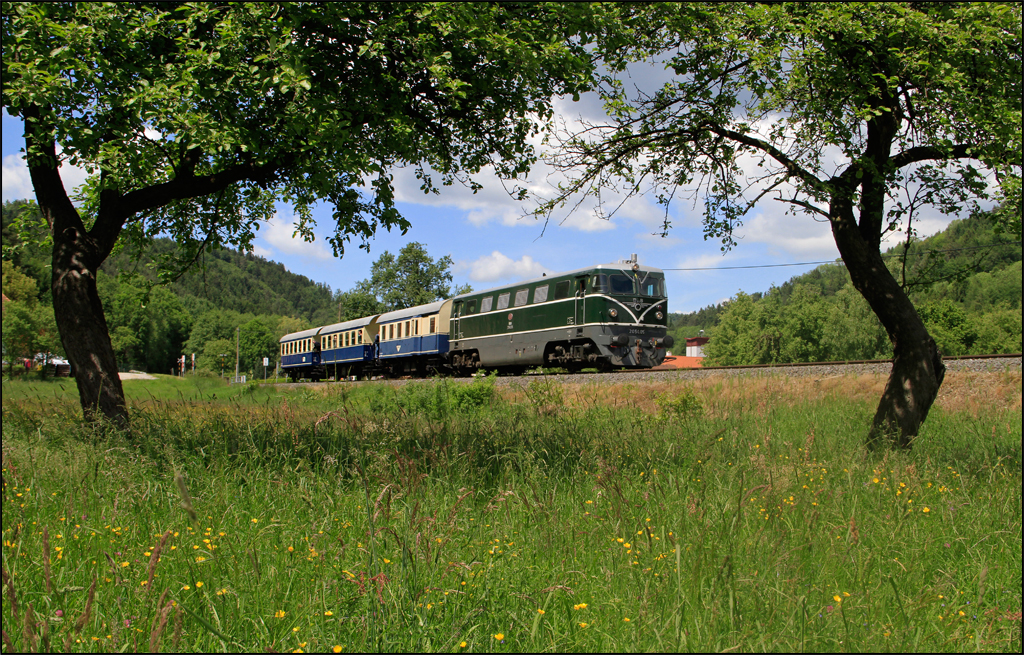 Da hat sich der Fotograf ein hübsches schattiges Plätzchen ausgesucht, um die Kapsch Lok im schönsten Licht abzulichten. Schöne Aufnahme !