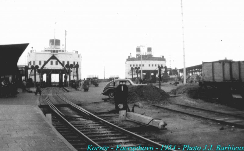 Beim rechten Trajekt tippe ich auf die 1927 gebaute Korsør oder die 4 Jahre jüngere Nyborg, beim linken Schiff wird das schon etwas schwerer, da die Einheiten der 30er Jahre starke Ähnlichkeiten miteinander hatten was das Vorschiff und die Brückenaufbauten mit den Zwillingsschornsteinen angeht. Aufgrund des Aufnahmedatums 1954 in Korsør tippe ich allerdings auf die SJÆLLAND des Baujahres 1933.
