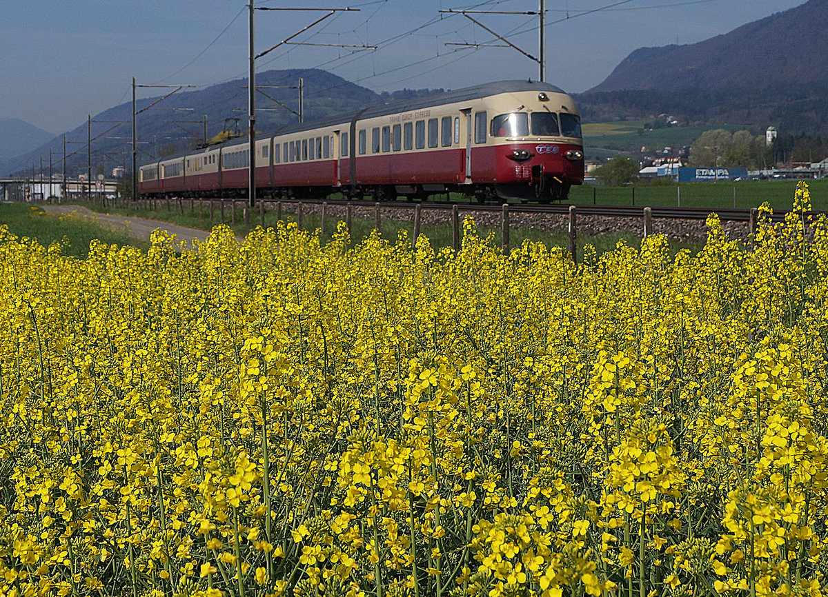 Ein wunderschönes Bild des TEE Rheingold, der für wenige Kilometer auf seine alte Strecken (Basel-Olten und Renens VD - Lausanne) zurückkehrte, freilich bot der damals von einer Re 4/4 I gezogene Vier-Wagen-Zug (Abteiwagen/Grossraumwagen/Speisewagen und Aussichtswagen) ein weitaus kompakters und einheitlichers Bild.