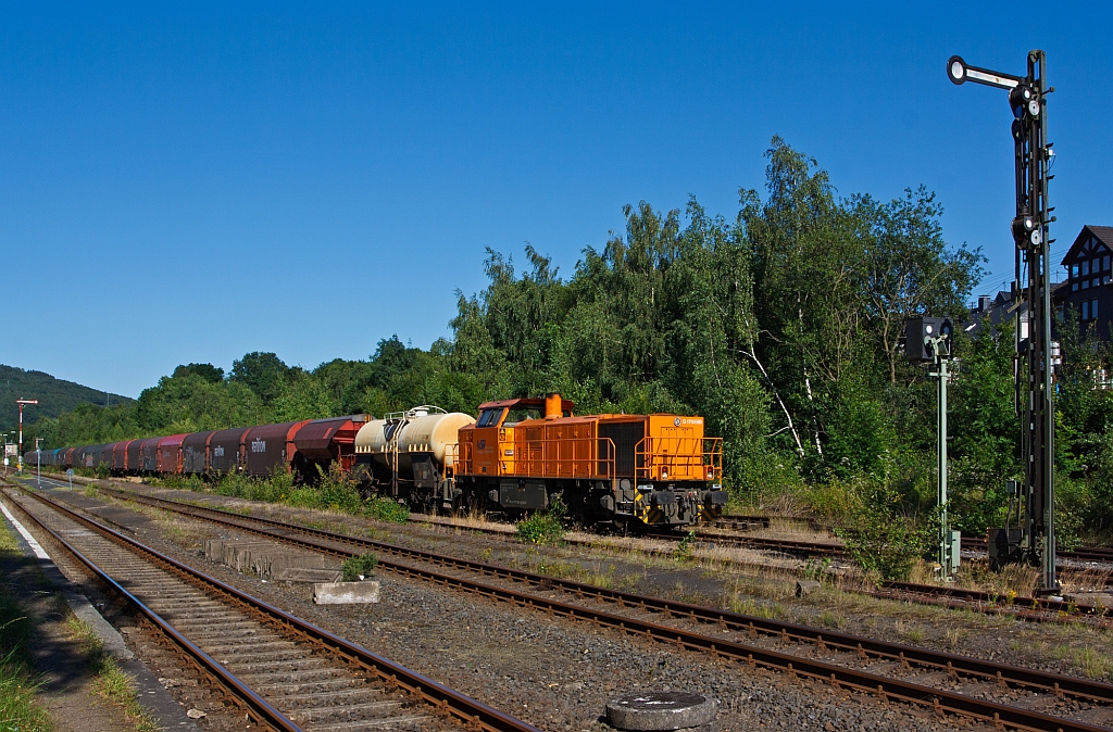 Ein prächtiges Bild mit der orangen Lok und den Formsignalen!