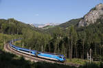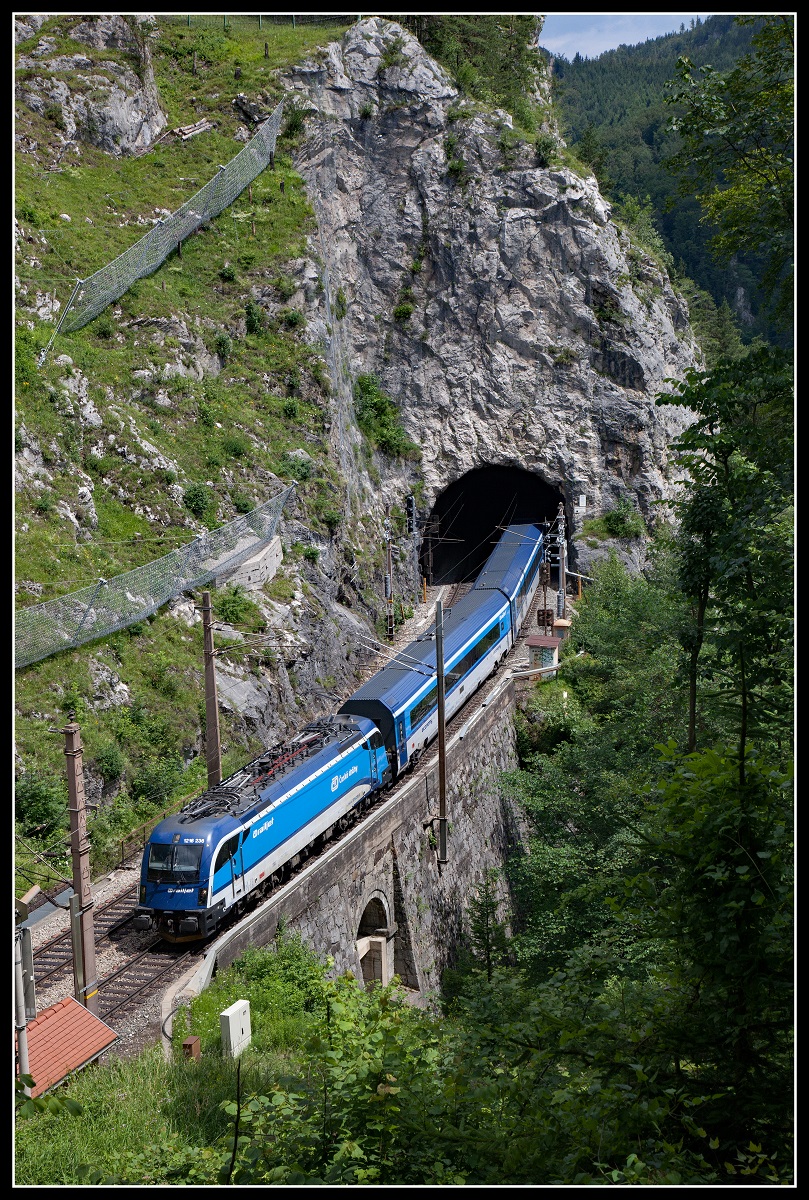 Schade ! Blauer Railjet mit perfekter blauer Lok, und ausgerechnet dann ein Wolkenschaden über der Rax ... ; ))
