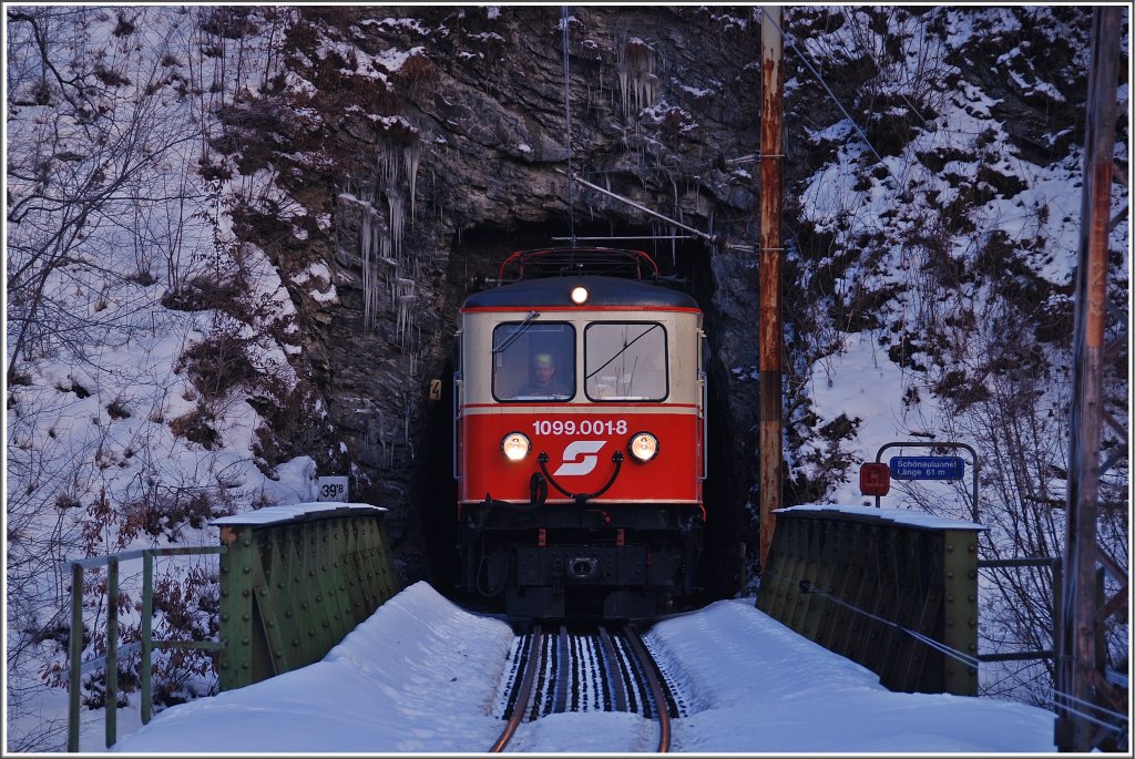 Auf diesem Bild ist die 1099 001 mit dem R 6805 zu sehen, wie sie gerade den Schönautunnel am Morgen des 29.12.2010 verlässt. (to the image)