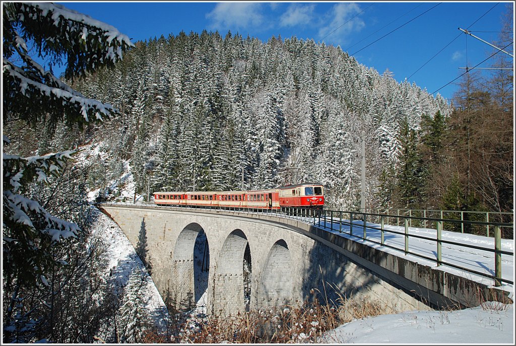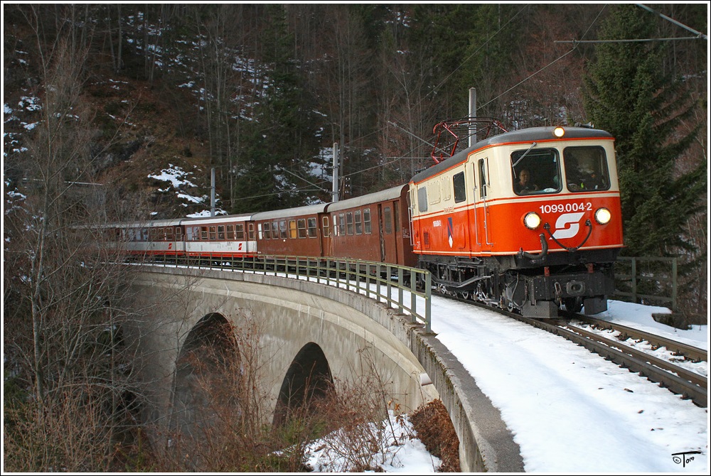 Am 29.12.2010 bestand der R 6853 aus der 1099 013 und 5 Ötscherbär-Waggons, den ich hier auf dem Klausgrabenviadukt ablichten konnte. (to the image)