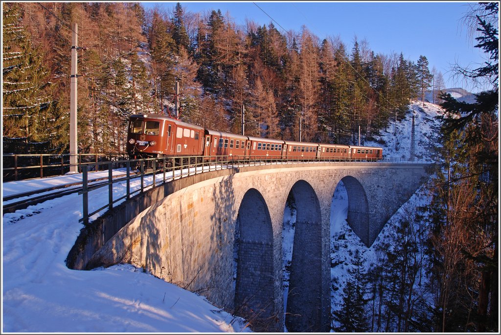 Mit den letzten Sonnenstrahlen des Tages überquerte die 1099 013 mit ihren 5 Ötscherbär-Waggons als R 6810 den Saugrabenviadukt kurz nach Annaberg. (to the image)