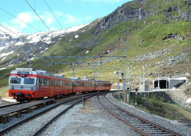 69 669 am 14.06.2006 im Bahnhof Myrdal, im Hintergrund die Einfahrt des 5311 Meter langen Gravhals-Tunnels (Richtung Voss - Bergen).