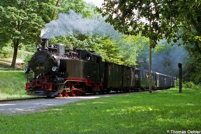 99 713 fährt am 09.07.06 aus Radebeul kommend in den Hp Lössnitzgrund ein. Am Haken ist ein Zug aus historischen DRG Wagen.