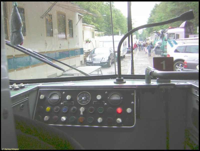 Aus der Fahrerperspektive betrachtet: Das Gleis der sogenannten Eintageslinie, die nur einmal im Jahr während des Volksfestes Wäldchestag zwischen Oberforsthaus und Riedhof befahren wird. Dieses Jahr wurde die Strecke an zwei Tagen befahren, anläßlich einer Sonderfahrt am 03.06.2006 mit dem Museumstriebwagen 111 (ex902 Baujahr 1969) der Bauart O. Am Oberforsthaus ist es während des Wäldchestages immer sehr eng, da die Schausteller auf beiden Seiten ihre Autos und Wohnwagen abstellen, wie der Blick aus dem Führerstand zeigt. Anmerkung: Der Wagentyp O war der erste Wagen der Frankfurter Straßenbahn mit geschlossener Fahrerkabine, die Aufnahme entstand aus dem Fahrgastraum heraus durch die geöffnete Fahrerkabinentür.
