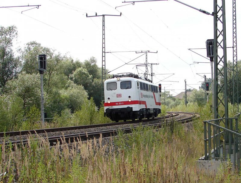 BR 110 511-3 macht sich auf dem Weg zum Rostocker Seehafen. Aufgenommen am 3.8.06