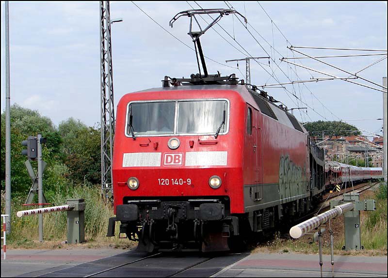 Die 120 140-9 vor dem AZ1436 nach Dortmund. Fotografiert am Bü Carl Heydemann Ring, mit Blickrichtung Hbf. (Stralsund am 29.07.06)