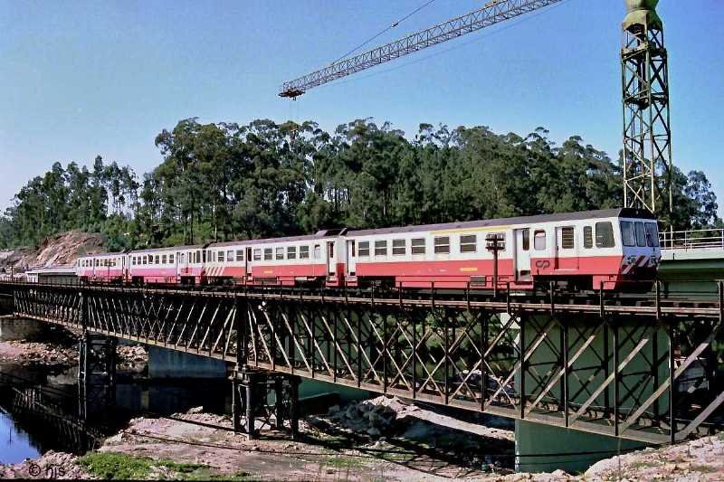 Die beiden Triebzüge 9610+9620 überqueren den Rio Ave bei Vila do Conde (14. Mai 1988). Die alte Brücke war ein beliebtes Fotomotiv. Hier ist bereits eine Seite durch den Neubau verdeckt. Bald wird die alte Brücke ganz verschwunden sein.