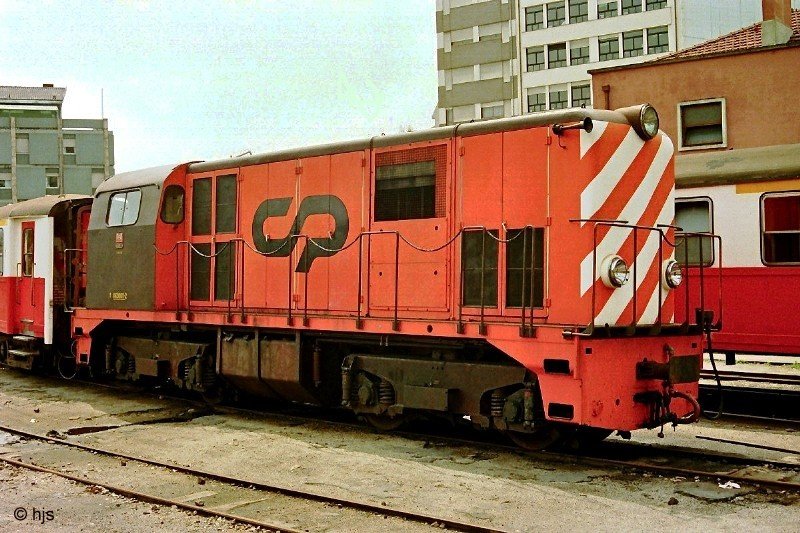 Lok 9001 in Porto Trindade (3. Mai 1988). Die CP hat 1974 diese mit fünf weiteren zwischen 1959 und 1967 von Alsthom und Eskalduna gebauten dieselelektrischen Lokomotiven gebraucht in Spanien erworben und als Nr. 9001 - 9006 bezeichnet.