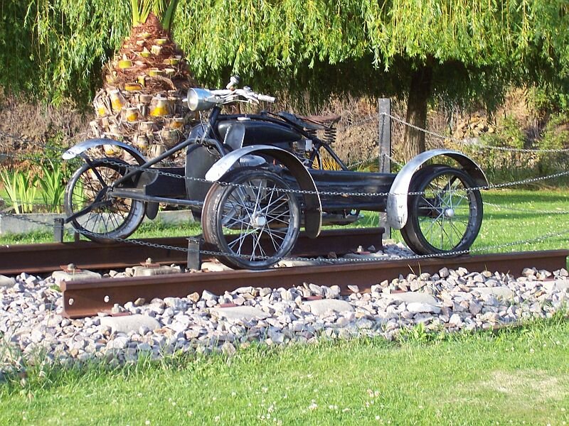Motorrad-Draisine für Breitspur am 12.05.2006 als Denkmal im Bahnhof Regua.