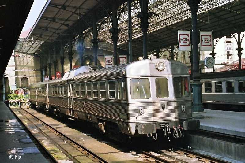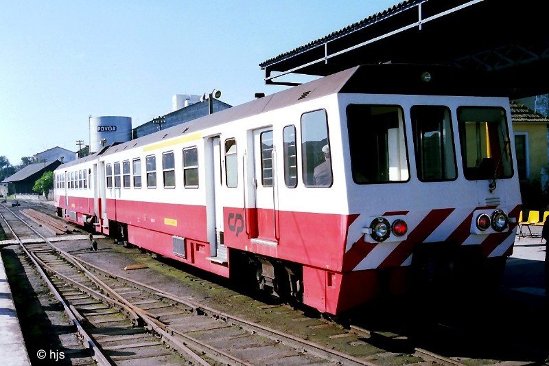 Triebzug 9608 (vorn im Bild der Steuerwagen) im Bahnhof Póvoa de Varzim (15. Mai 1988). Hier endeten die Züge aus Porto. Zwar führte die Strecke noch rund 30 km weiter bis Famalição, aber es gab keinen durchgehenden Verkehr.