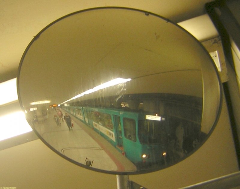 U-Bahn-Station Bockenheimer Warte am 08.06.2006 mit den Ptb-Triebwagen 704, 732 und 708 auf dem 7. Zug der U6 zur Heerstraße als Spiegelbild.