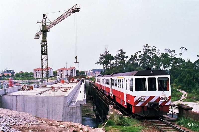 Während die Züge noch über die alte Ave-Brücke von 1875 bei Vila do Conde rumpeln (Hier: 9613+9604), entsteht daneben schon eine moderne Betonkonstruktion. Der Neubau ist im Hinblick auf künftige Ausbaupläne schon für zweigleisigen Betrieb ausgelegt (13. Mai 1988).