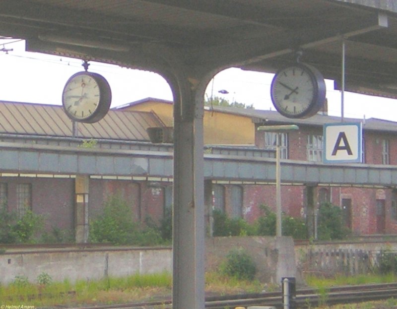 Zwei verschiedene Uhrzeiten an einem Bahnsteig: Bahnhofsuhren im Gießener Hauptbahnhof, am 05.06.2006 aufgenommen.