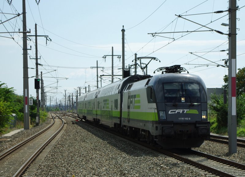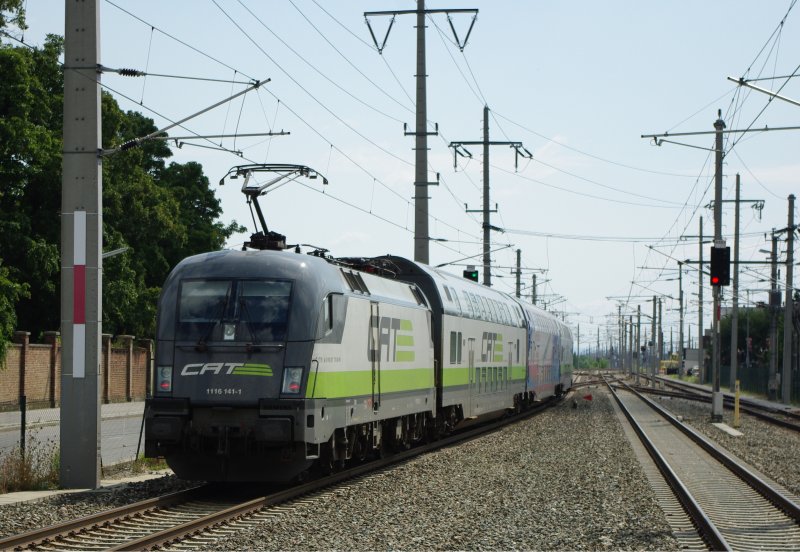 An der Station Wien Zentralfriedhof, nicht unweit vom Wiener Zvbf, kann man die CAT's in feier Wildbahn beobachten. Hier 1116 141-1 in Richtung Flughafen. 23.08.2009.