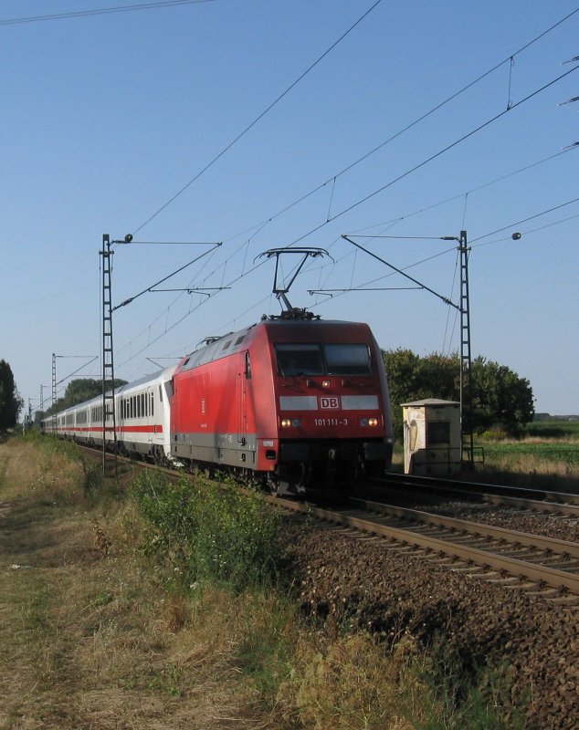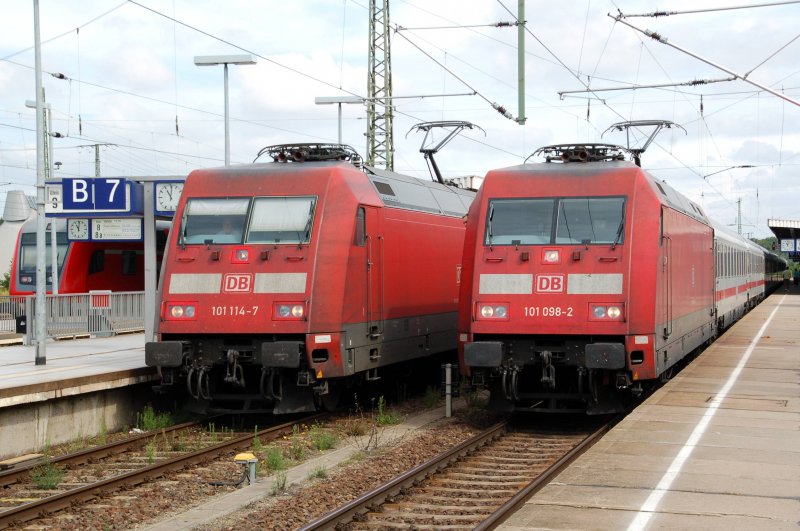 101 114 und 101 098 stehen am 03.08.09 mit ihren ICs im Magdeburger Hbf.