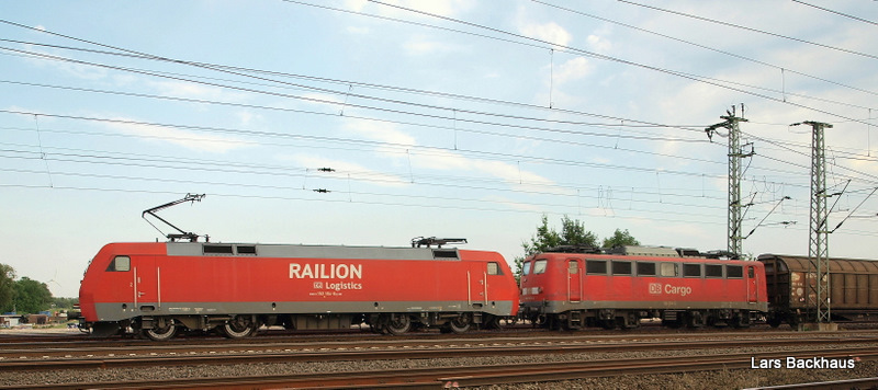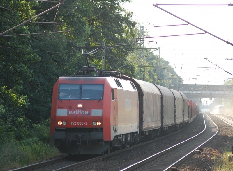 152 065-9 wird in Kürze Seelze erreichen, während im Hintergrund IC 2142 Köln entgegenstrebt, und in wenigen Minuten Wunstorf druchfahren wird. 6.8.09
