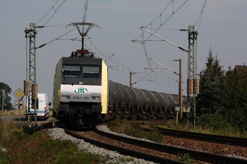 152 901 der ITL mit einem Ganzzug aus Kesselwagen, hier beim Passieren des Bahnüberganges in Jessen, 19.08.09