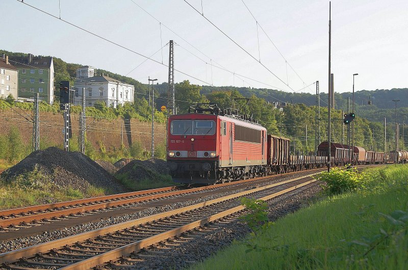 155 107 mit einem langen Güterzug auf der Fahrt von Gremberg nach Hagen Vorhalle am 19.08.2009 in Wuppertal Steinbeck. Auf dieser steigungsreichen Strecke sind die Triebfahrzeuge der Baureihe 155 einige der wenigen Baureihen, die derart hohe Lasten in Einzeltraktion befördern können.