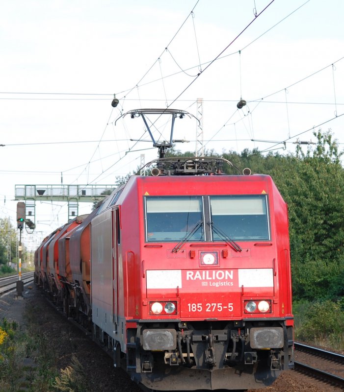 185 275-5 ist mit ihrem Güterzug am 6.8.09 bei Dedensen/Gümmer nach Westen unterwegs.