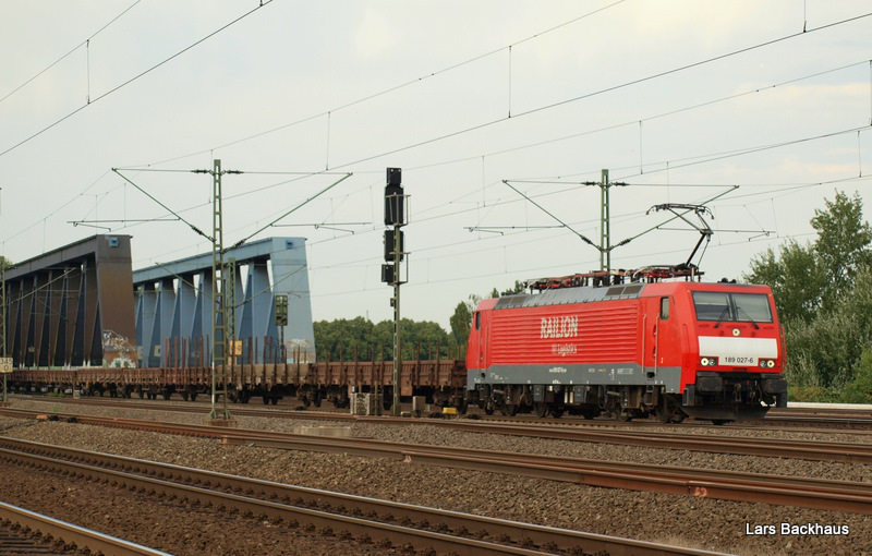189 027-6 hat einen Flachwagenzug aus Norden beim überqueren der Süderelbbrücken am 20.08.09 am Haken.