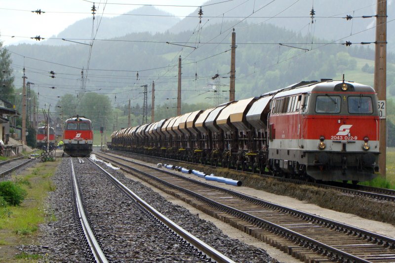 Nur einen Tag nach der Dekaschierung der Portugallok 1016 025 bespannte sie den Bedarfszug 90137 nach Fentsch. Die Aufnahme zeigt den Zug bei der Ausfahrt aus dem Bahnhof Gesäuse Eingang am 20.8.2009.