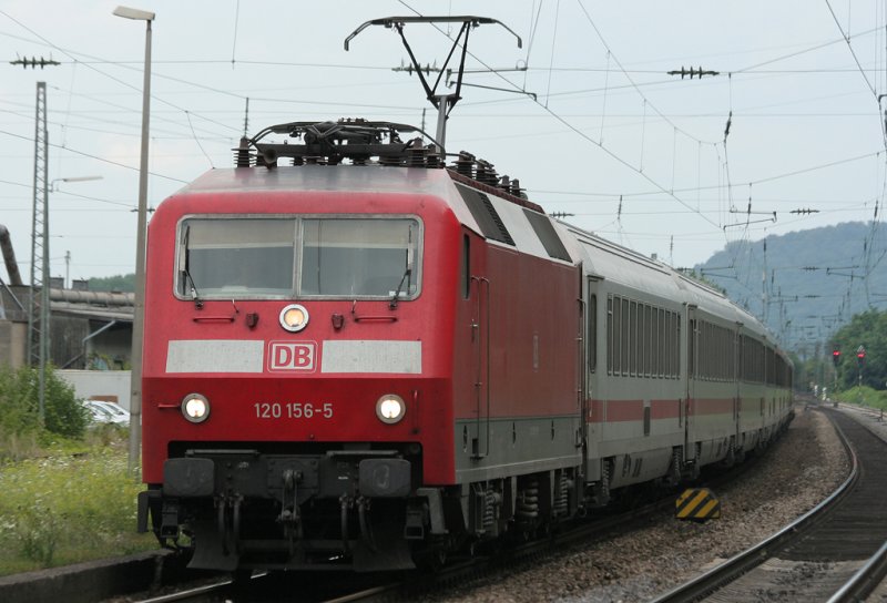 Die 120 156-5 zieht einen IC durch den Bahnhof Brohl, aufgenommen am 11.08.2009