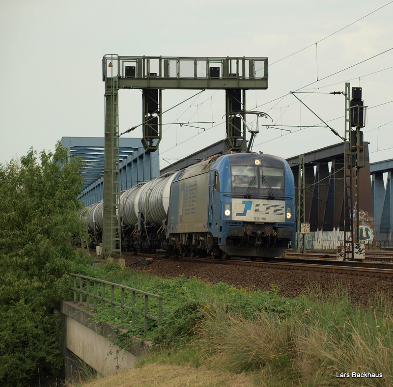 Ein Kesselwagenzug aus Hohe Schaar geführt von der zur LTE gehörenden 1216 910 poltert am 20.08.09 über die Süderelbbrücken Richtung Süden.
