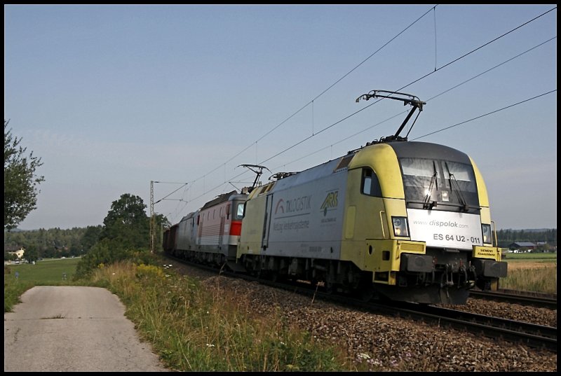 ES64U2-011 und 1144 203 (9181 1144 203-7) schleppen die "Kalte" 185 539 und einen Schrottzug(?) nach Italien.