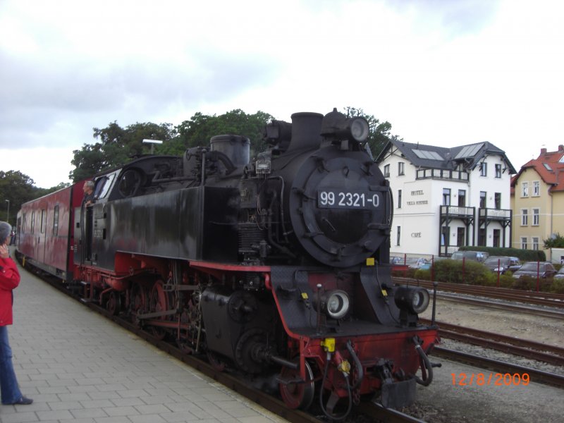 Mecklenburgische Bäderbahn "Molli" als MBB 14628 mit BR 99 2321-0 nach Kühlungsborn West im Bahnhof von Bad Doberan, 15:23 Uhr 12.08.2009