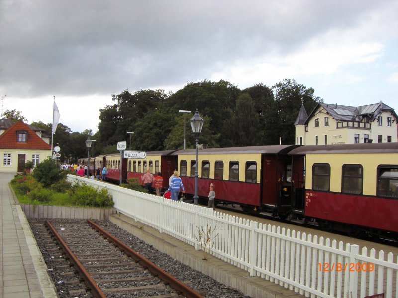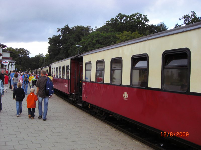 Mecklenburgische Bäderbahn "Molli" als MBB 14628 nach Kühlungsborn West im Bahnhof von Bad Doberan, 15:25 Uhr 12.08.2009