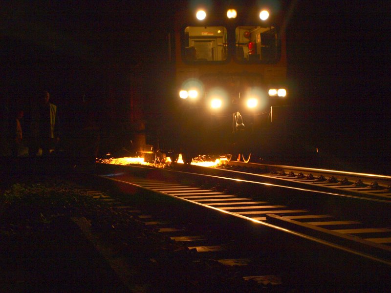 Nachtschicht am Westbahnhof Aachen, hier werden die Schienen mit einem Schienenschleifzug mit viel Lärm und Funkenflug wieder in Form gebracht.